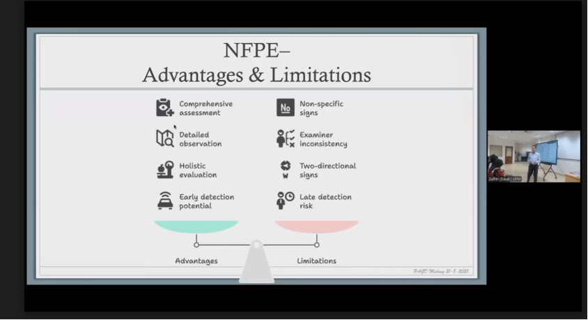 Materi yang disampaikan mencakup konsep dasar NFPE sebagai metode pemeriksaan fisik terstruktur untuk menilai status gizi melalui identifikasi tanda defisiensi zat gizi, perubahan massa otot dan lemak tubuh, hingga deteksi dini malnutrisi. Prof. Zulfitri juga menekankan pentingnya keterampilan observasi klinis dan integrasi hasil NFPE dalam pengambilan keputusan dietetik agar intervensi gizi dapat lebih tepat sasaran dan efektif.