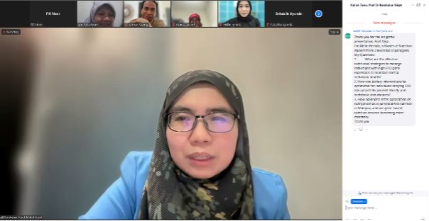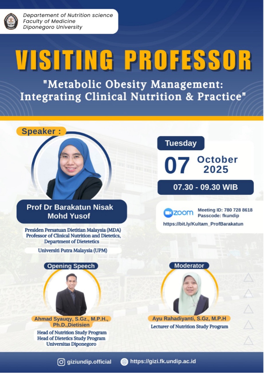 To support internationalization and enhance academic quality, the Nutrition Department of the Faculty of Medicine, Diponegoro University, organized an International Visiting Professor Online session as part of the UNDIP World Class University (WCU) 2025 Program. This event featured Prof. Dr. Barakatun Nisak Mohd Yusof from Universiti Putra Malaysia (UPM), an expert in clinical nutrition, metabolic obesity, and diabetes.