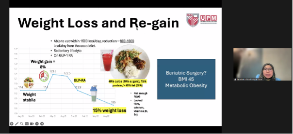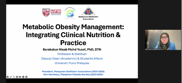 During the session, Prof. Dr. Barakatun Nisak Mohd Yusof delivered a comprehensive presentation on integrative approaches to managing metabolic obesity, covering topics such as obesity physiology, clinical nutrition intervention planning, and evidence-based dietetic practices. Participants also engaged in clinical case discussions and practical sharing sessions focusing on simulated calculations of energy and nutrient requirements for patients with metabolic obesity.