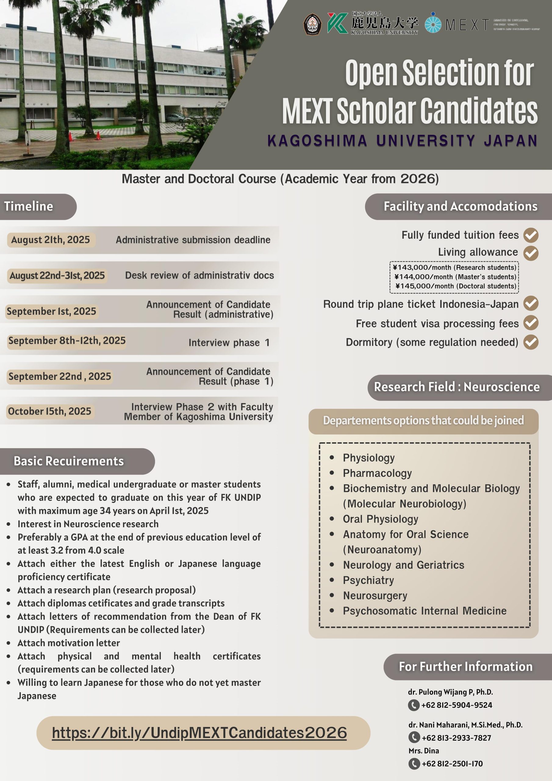 Semarang, 17 Juli 2025 — Mahasiswa dan alumni Program Studi Gizi Fakultas Kedokteran Universitas Diponegoro kini memiliki kesempatan langka untuk melanjutkan studi ke jenjang Master atau Doktoral di Jepang melalui program beasiswa prestisius dari Pemerintah Jepang, yaitu MEXT Scholarship. Program ini ditawarkan oleh Kagoshima University untuk tahun akademik 2026 dan secara khusus terbuka bagi mereka yang memiliki minat dalam riset di bidang Neurosains.