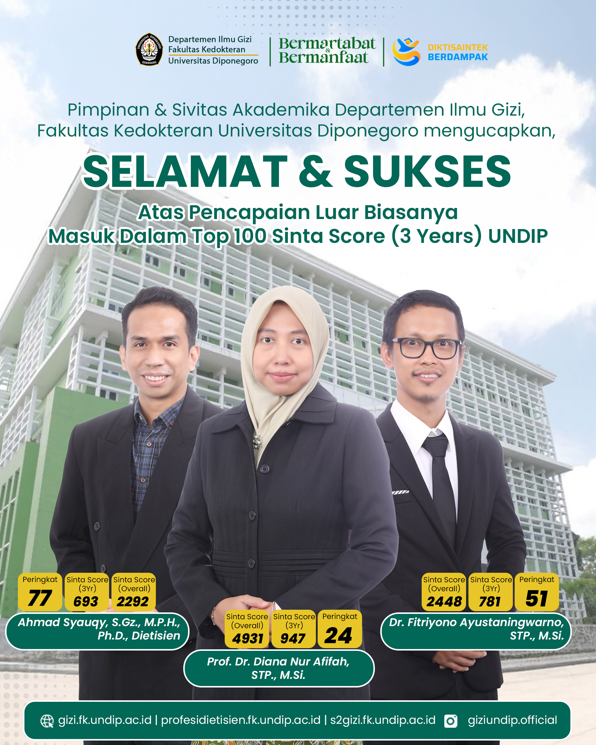 Semarang, March 2026 – Proud news comes from the Department of Nutrition, Faculty of Medicine, Universitas Diponegoro (UNDIP). Three of its distinguished faculty members have achieved an exceptional milestone by being ranked among the Top 100 SINTA Score (3 Years) at UNDIP, reflecting their strong research performance and consistent academic contributions.