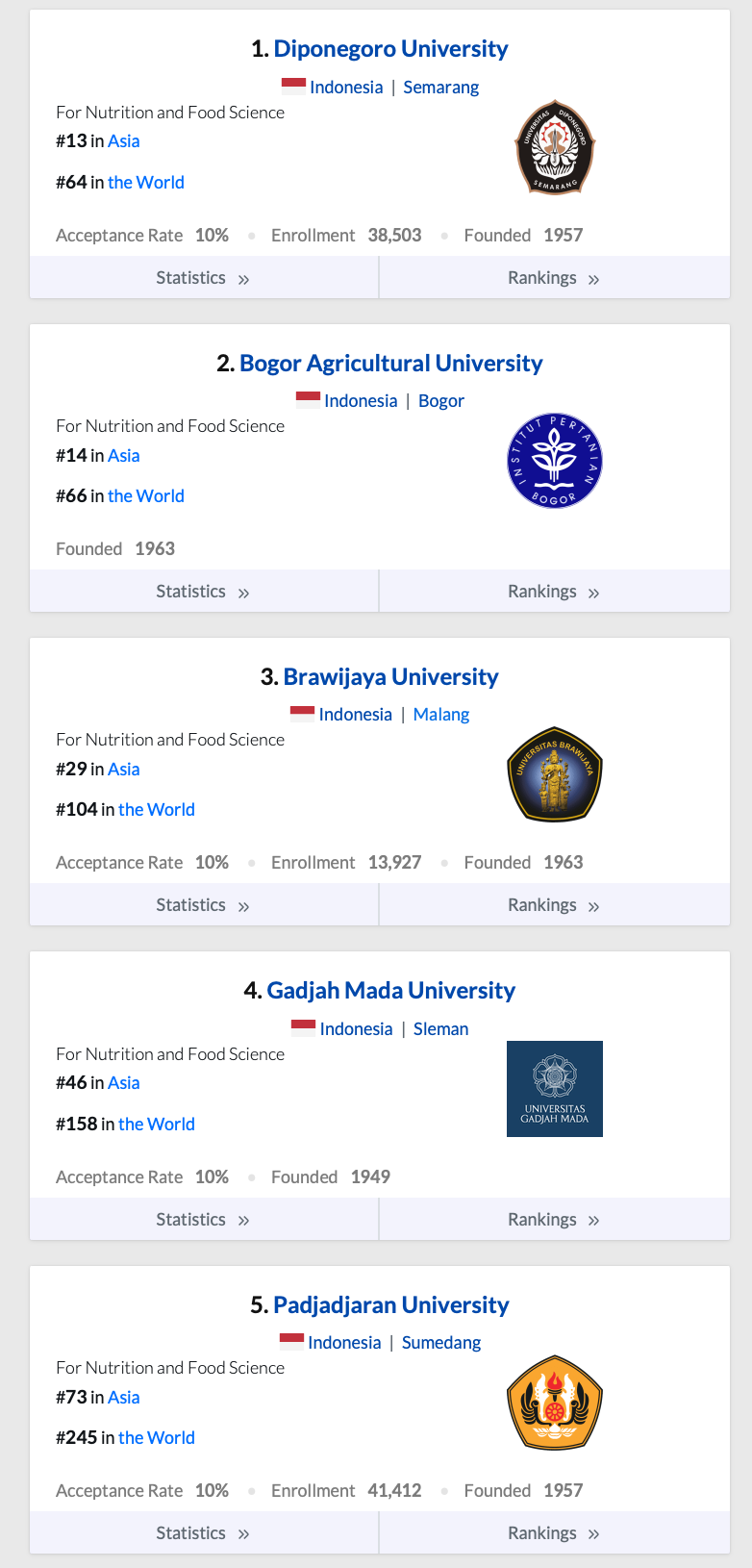 Universitas Diponegoro (UNDIP) has once again achieved a remarkable milestone at both national and international levels by securing the first rank in Indonesia in the field of Nutrition and Food Science according to the EduRank 2026 rankings. This accomplishment reinforces UNDIP’s position as a leading higher education institution in advancing nutrition and food science. Beyond its national achievement, UNDIP also demonstrates strong global competitiveness, ranking 13th in Asia and 64th worldwide, reflecting its academic excellence, research productivity, and growing international recognition.